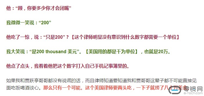 并表示,如果双方都未说谎的话,是“这个美国律师要两头吃,一下子就捞了八十万美金。”