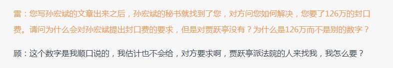 雷锋网问及“您写孙宏斌的文章出来之后,孙宏斌的秘书就找到了您,对方问您如何解决,您要了126万的封口费。请问为什么会对孙宏斌提出封口费的要求,但是对贾跃亭没有?为什么是126万而不是别的数字?”顾颖琼表示,“这个数字是我顺口说的,我估计也不会给,对方要求啊,贾跃亭派法院的人来找我,我怎么要?”