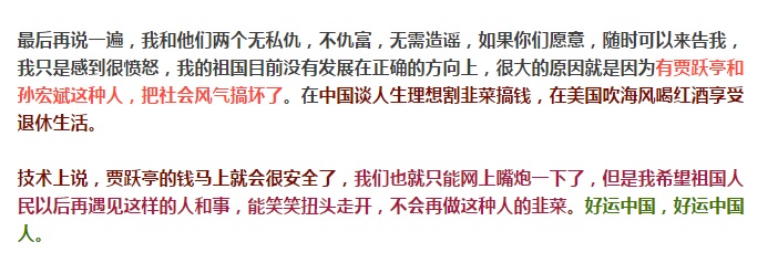 顾颖琼曾在2017年9月15日发表《我为什么写文章”怼”亿万富翁贾跃亭和孙宏斌?仇富?私仇?造谣?》一文,表示与二人并无私仇。“我只是感到很愤怒,我的祖国目前没有发展在正确的方向上,很大的原因就是因为有贾跃亭和孙宏斌这种人,把社会风气搞坏了。”