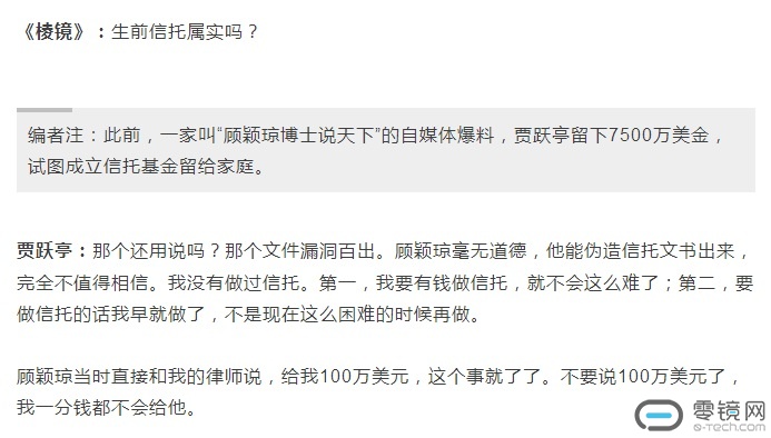 在腾讯新闻《棱镜》栏目与贾跃亭的对话中,《棱镜》问及贾跃亭生前信托是否属实时,贾跃亭表示“那个文件漏洞百出。顾颖琼毫无道德,他能伪造信托文书出来,完全不值得相信。”并表示,“顾颖琼当时直接和我的律师说,给我100万美元,这个事就了了。不要说100万美元了,我一分钱都不会给他。”
