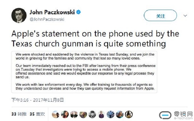 如今,苹果手机再次涉案。在11月发生的得克萨斯州萨瑟兰泉教堂枪击案中,凶手迪文·凯利携带的正是苹果手机。但FBI却出奇的冷静,再也没有要求苹果提供帮助,以致于苹果不得不对此发声,称自己已联系FBI愿意提供帮助。