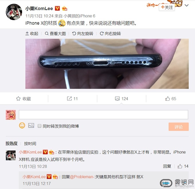 而在昨天“@小栗KomLee”在苹果体验店拍摄了一张iPhone X照片,画面中的iPhone X插口处已出现掉漆现象。该用户表示“速度未免太快了些,不到半个月。”但也有用户持反对意见,认为演示机在使用过程中磕磕碰碰在所难免。也有网友吐槽,“好像以前不掉一样。”