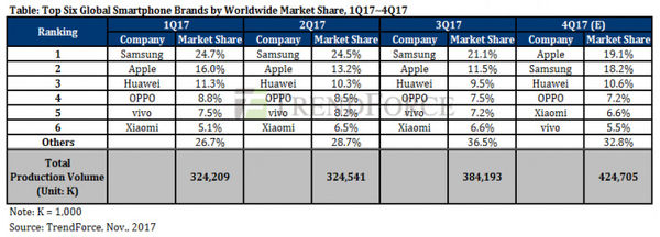 苹果iPhone X的屡屡曝出问题一再刷新我们的认知,不少人都试图询问苹果的品控到底怎么了?但就在苹果iPhone X曝出各种问题的同时,市场调查机构TrendForce公布的评估报告则显示,2017年Q4季度苹果出货量甚至可能超越三星,成为全球出货量最大的手机厂商。