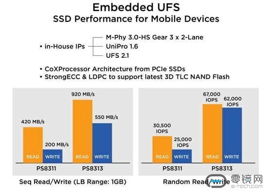 据Benchlife报道,Phison(群联电子)的新一代UFS主控已经通过测试。其中,主流级的PS8311读取420MB/s、写入200MB/s,高端的PS8313,支持UFS 2.1存储标准,最高读取920MB/s、写入550MB/s。这已经达到了NVMe闪存的级别。