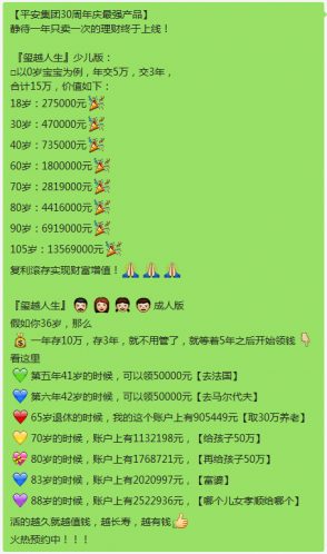 那么“玺越人生”究竟是个什么保险(理财)产品呢?它分为“少儿版”和“成人版”,我们以“少儿版”0岁宝宝为例分析,大概意思是: