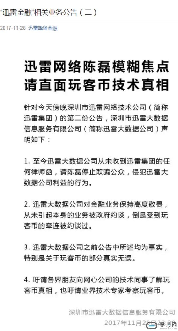 在双方争执中,迅雷大数据公司一直在通过子公司迅雷金融发声,并连发多条公告,包括《迅雷金融相关业务公告》《迅雷金融相关业务公告(二)》《公告(三)》,以及一篇名为《九评玩客币(一)》的文章。