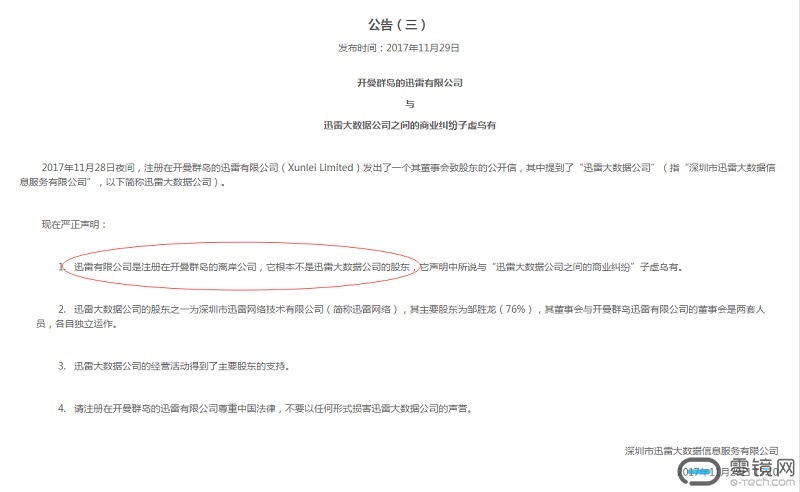 针对该公开信,迅雷大数据公司展开回应,称“迅雷有限公司是注册在开曼群岛的离岸公司,它根本不是迅雷大数据公司的股东,它声明中所说与‘迅雷大数据公司之间的商业纠纷’子虚乌有。”并表示,迅雷大数据公司的股东之一是深圳市迅雷网络技术有限公司(简称迅雷网络),坚称这是两套人员,独立运作。