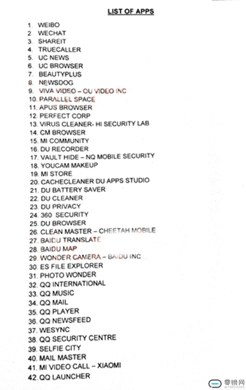 已经被禁止的包括Truecaller(真实来电:属于聊天通讯类软件类软件)、微信和UC等在内的42个应用程序的清单,所有官兵都被告知要严格按照清理官方和个人手机的指示。名单上还有一些小米应用程序,包括Mi Store,Mi Community和Mi Video call。其他流行的应用程序包括Viva Video,Shareit,BeautyPlus,Clean Master和ES File Explorer。