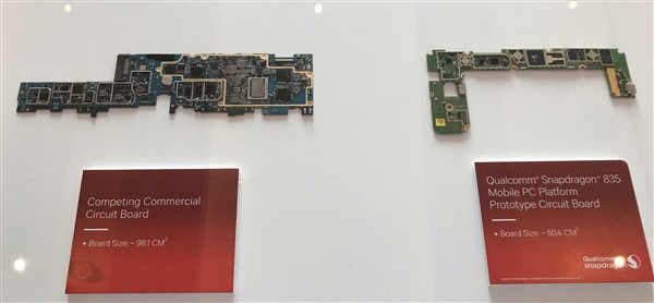 得益于高通骁龙835的高度集成化,采用其平台的笔记本电脑的主板可以做到很小。这也使得笔记本机身内部有更多空间可以任由厂商发挥,比如可以做的更小巧轻薄,或放下更大的电池。