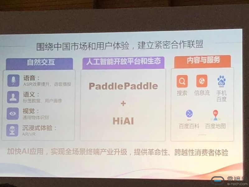 其次,百度的语音和图像技术会进入华为的移动终端,让人机沟通更加便捷,用AR打通虚拟与现实之间的界限;其实就是让AI功能用起来不再那么傻,AR应用不再那么虚