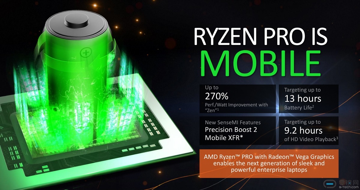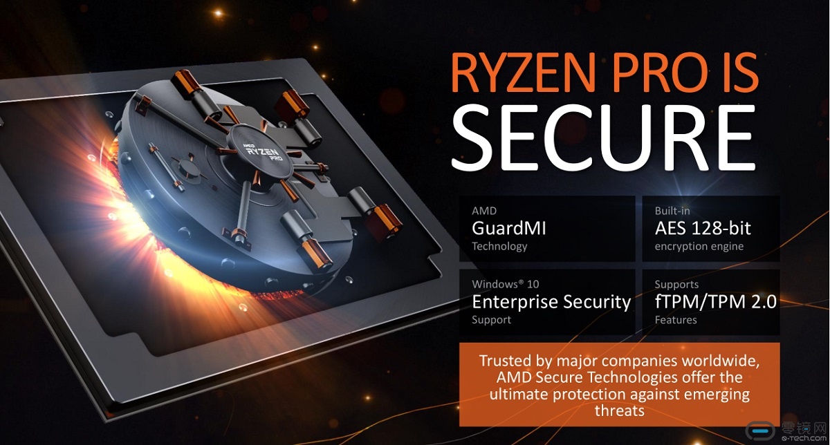 针对近期备受关注的CPU漏洞问题,这次AMD也特别强调了Ryzen Pro企业级处理器的安全性能。这款处理器采用4核8线程、3.8GHz,性能比Ryzen 7?PRO 2700U提升了22%。在描述该移动端处理器时,AMD尤为强调其安全性,包括采用AMD的GUARDMI技术、128Bit AES加密算法、Windows 10企业级安全等。