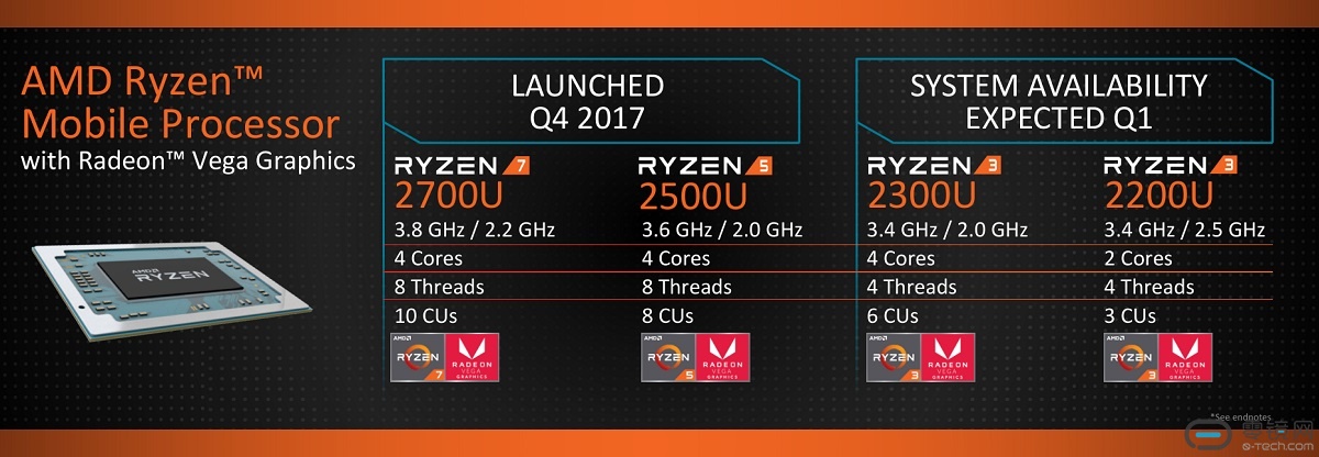 早在去年第四季度,AMD就发布了带Vega显卡的移动处理器Ryzen 7 2700U和Ryzen 5 2500U,而这次继续丰富产品线,推出功耗更低、更具性价比的Ryzen 3 2300U、Ryzen 3 2200U处理器。全系列都提供硬件级别的4K、HDR流媒体加速支持,以及更先进的针对电竞显示器的同步技术。