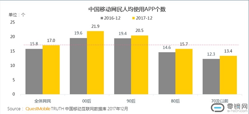 在这个互联网移动应用的舞台上,最具探索精神的莫过于90后和00后。虽然双方人均使用APP个数十分接近,但果然年龄越小,好奇心越强。00后尝鲜的渴望略微高于90后。
