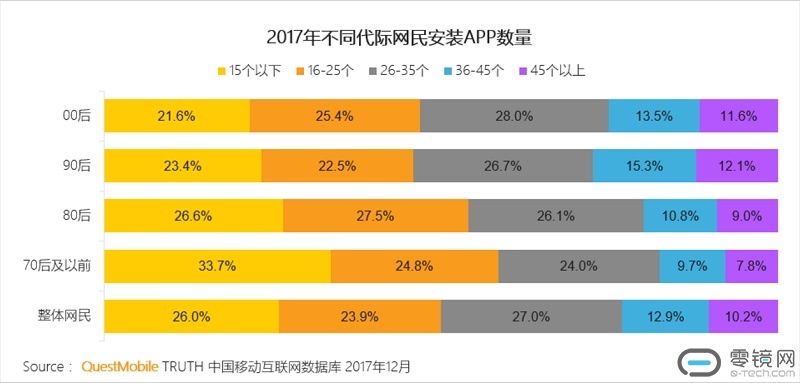 愿意尝鲜,也就意味着愿意安装更多数量的移动APP。在安装超过26个应用的人大有人在,而90后和00后当仍不让地占据了榜前,甚至以压倒性的优势占据安装超过36个、45个应用的榜首。就是不知道,这些APP用过几次,会不会懒得卸载。