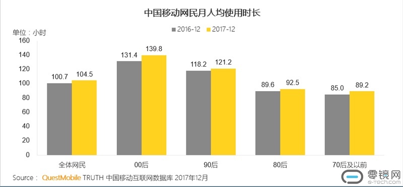 或许正是有了如此好动的00后和90后,中国移动网民的月人均使用时长被拔高了很长一截。但是忙于生计的90后在这场比赛中却输给了00后,00后月人均使用时长超过90后近20个小时。却不知道这些时间是趁90后上班,在课上玩手机多出来的,还是趁90后疲惫地休息时,在被窝中捂出来的?