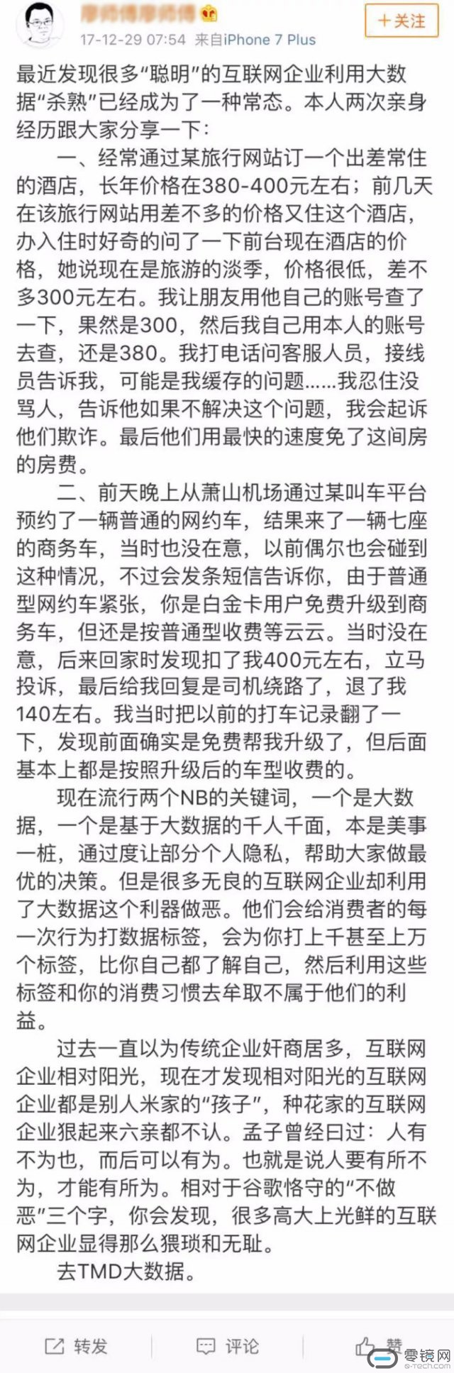 分享一个有趣的故事,一个资深互联网用户因为被大数据“杀熟”愤怒了:“去TMD的大数据”这是来自他心底的呐喊。我看过他的讲述,我非常理解那种被“杀熟”后的厌恶感。