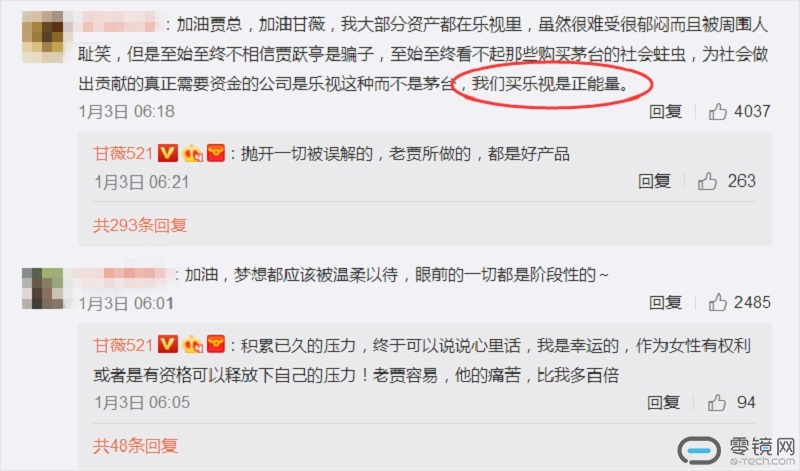 2.对乐视有着情怀。在贾跃亭、甘薇的微博下,始终有着一批对乐视有着情怀的人,在鼓励并满怀憧憬地期待着。