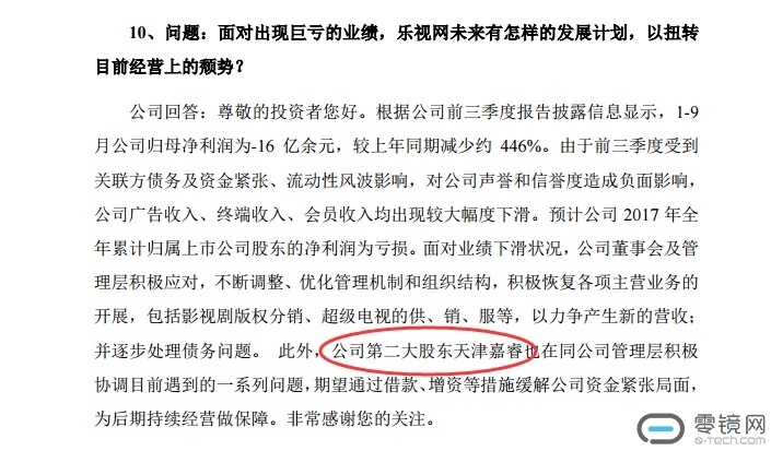 乐视网的亏损或许早就在意料之中,但更为关键的问题在于,乐视网的资金是不是能够支撑到乐视回暖那一天的到来?在被问及“乐视网未来有怎样的发展计划,以扭转目前经营上的颓势?”时,乐视除了阐明自身的主张,也将自己的第二大股东,融创下的天津嘉睿摆了出来,表示天津嘉睿“期望通过借款、增资等措施缓解公司资金紧张局面”。