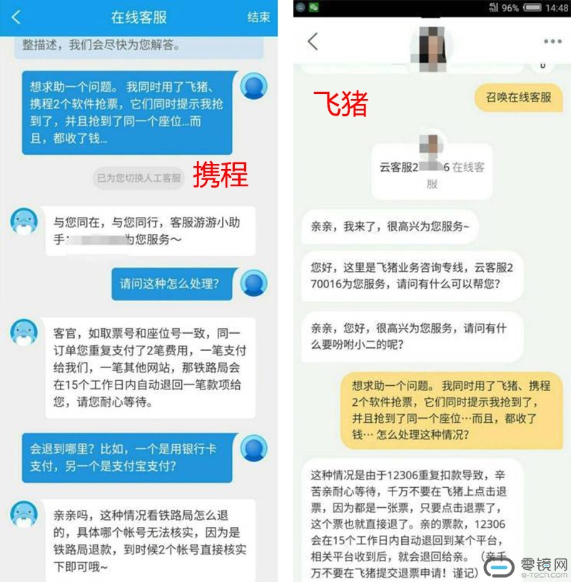 用户小钟也分别与两家平台的客服进行了沟通,携程方面表示:当订单重复支付时,铁路局会在15个工作日内自动退回一笔款项。飞猪方面则表示:12306会将多出款项退给平台,再由平台退回用户,并叮嘱用户不要提交退票申请。而对于到底是哪家抢到了票,两方均未回应。此外,小钟还曾收到来自飞猪的一条提醒短信,内容大概:“若多平台同时购票,多扣票款请联系该平台客服”等字样,可以看出,以上问题或许早已有之。