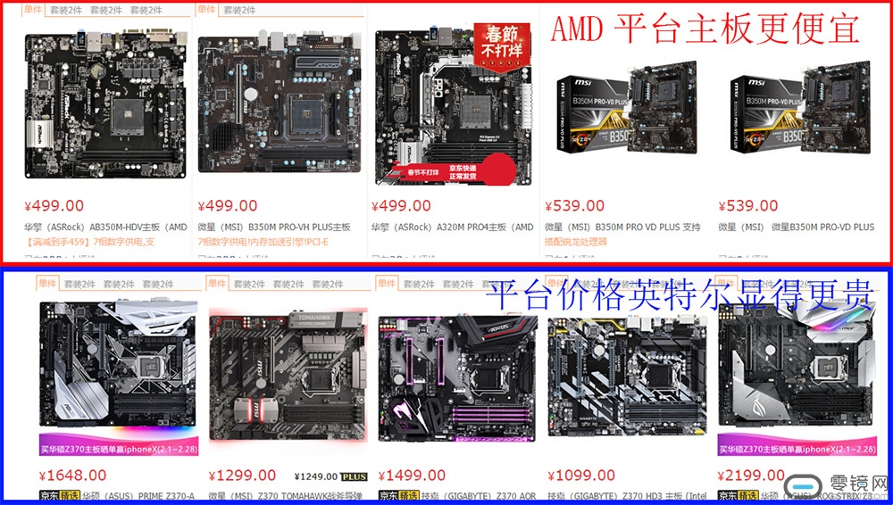 同价位锐龙总是比酷睿拥有更高的核心规格,再加上主板便宜,最顶级的桌面锐龙也能在500元不到的B350主板上发挥自如,甚至300多元的A320也能完美支持。但反观英特尔,最便宜的酷睿i3也得搭配上1000元左右的Z370,本来单CPU价格就不占优,主板一坑就显得英特尔平台整体竞争力更低下。