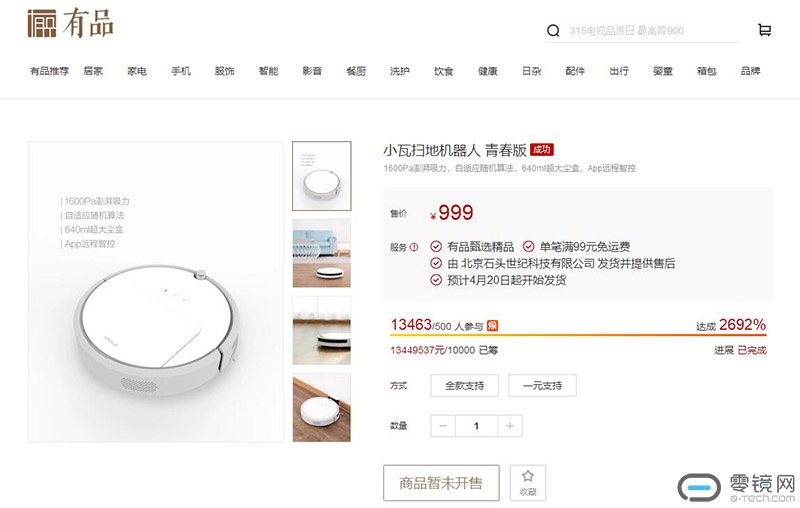 近日,小米有品商城上线众筹了一款售价999元的小瓦扫地机器人,4月20日开始发货。目前已经有13463人参与,众筹金额达到了1300多万元。我最近准备入手一台扫地机器人,所以有空的时候会关注一下,当时觉得这个小瓦性价比不错,但是牌子貌似没听过。