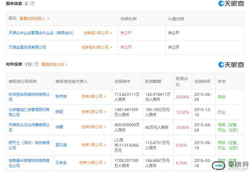 查询天津金米投资合伙企业(有限合伙),其对外投资了113家公司,继续往上溯源,股东有两个:天津众米企业管理合伙企业(有限合伙)和天津金星投资有限公司。