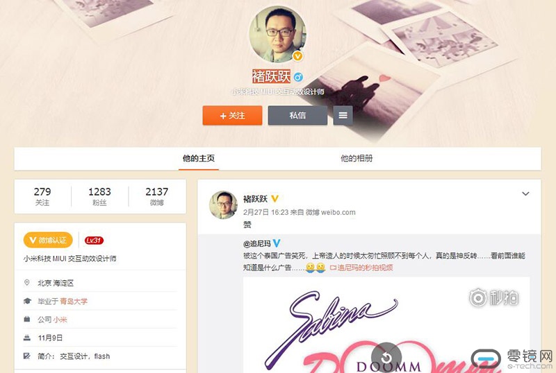 以“小兄弟”天津拾伍米企业管理合伙企业(有限合伙)为例,其拥有42位自然人股东,其中排名第一名为褚跃跃。在天眼查上看不到他更多的消息,不过我们在微博上查到了一位标注为“小米科技MIUI交互动效设计师”的褚跃跃,二者究竟是否同一个人我们还不确定。