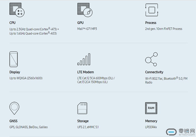 今年三星的处理器全部加上全网通基带已经是非常明确的战略,所以Exynos 9610支持6模全网通,下载速度最高Cat.12 600Mbps(3CA),Wi-Fi支持802.11ac 2×2 MIMO、蓝牙5.0等。