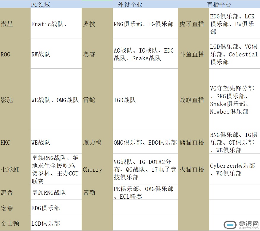 这些企业中,不乏很多跨领域的企业甚至各种与电竞并不相关的企业,他们对于电竞的赞助收效几何我们暂不讨论。我们主要来看看,在电脑硬件垂直领域和游戏外设领域的企业,都赞助了哪些战队(俱乐部),毕竟他们才是最接近电竞行业的。