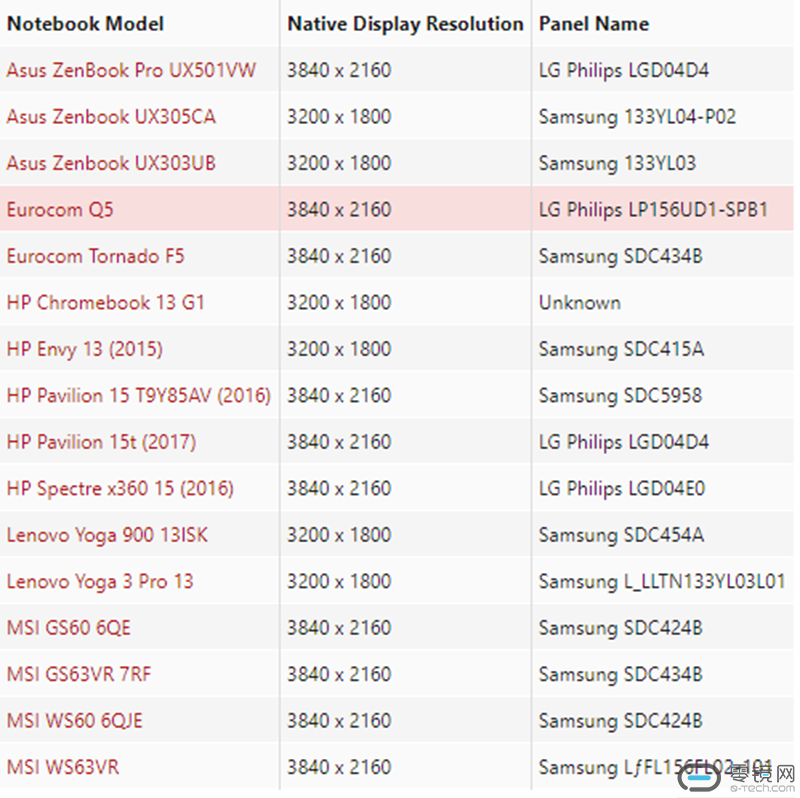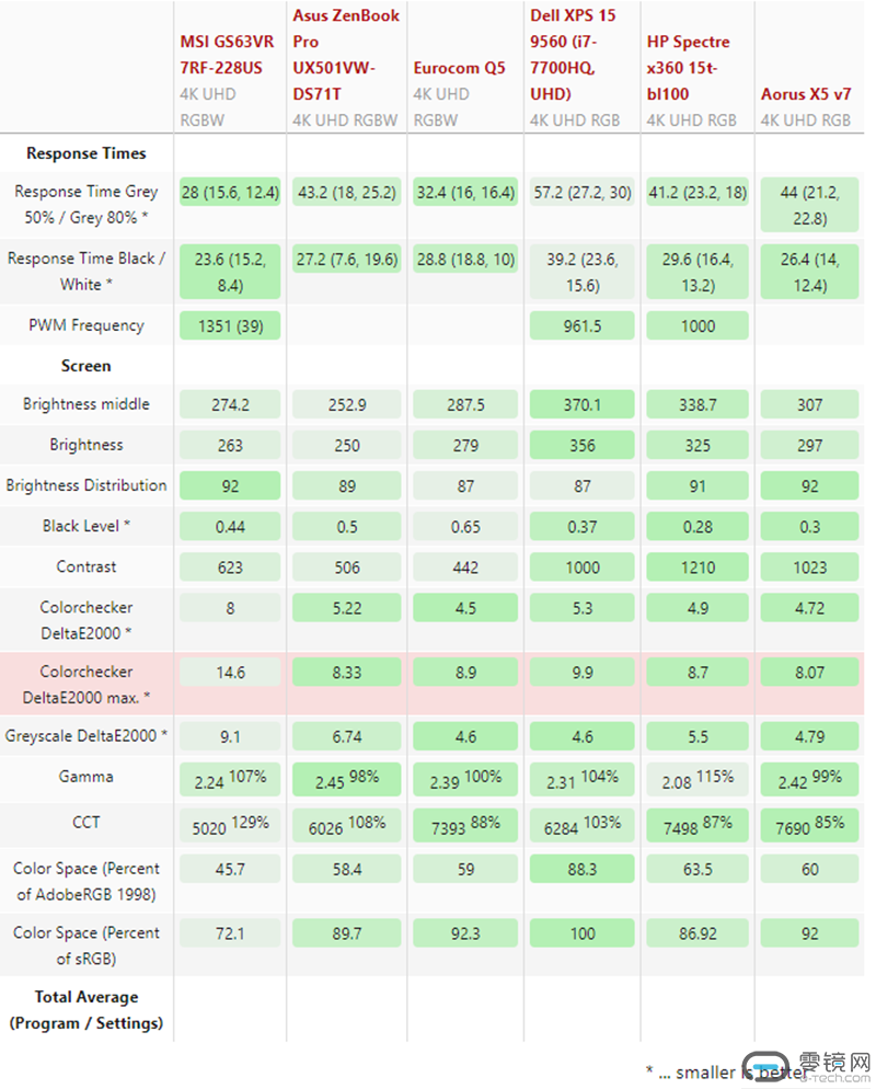 在确定了4K RGB优于4K RGBW后,我们可以分辨一下市场上那些笔记本是搭载的4K RGBW。由于4K现有的各种型号以及上述几乎所有制造商都选择不透露所用面板类型的这一事实,我们无法从官方渠道获取相关信息了。不过,我们可以从测试渠道上拿到相关数据。具有RGBW显示面板的笔记本不完整列表,如图所示: