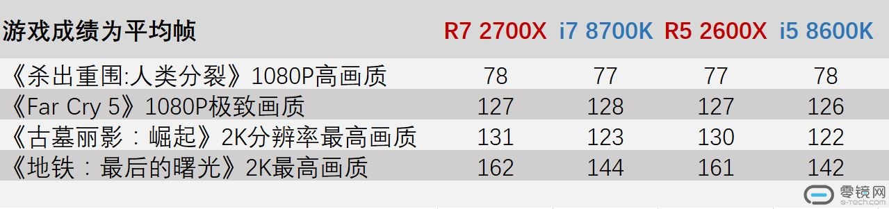 接下来实际的4款游戏体验中,酷睿也没能展现出长期以来引以为傲的游戏计算优势。几款游戏的1080p分辨率体验中两者搭配同一张显卡时,帧率都是旗鼓相当的。而分辨率来到2K超高清后,R7 2700X平台还有2款游戏的平均帧率逆袭!