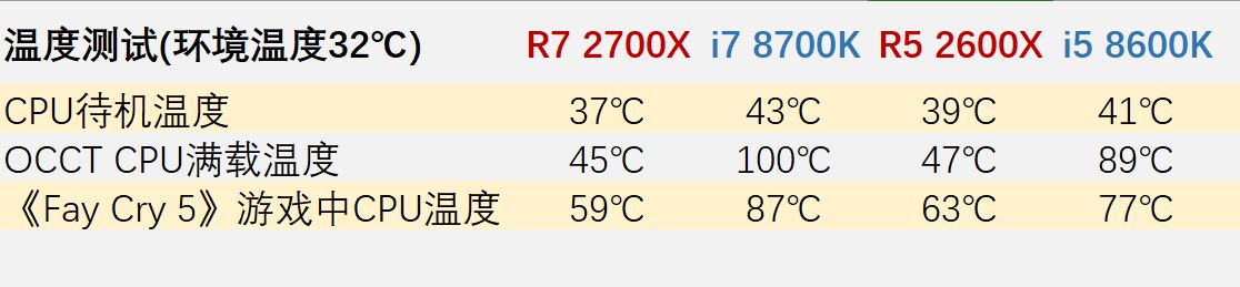 然而与OCCT的结果不同,实际游戏中,几款处理器的温度表现显然更加真实(针对OCCT等测试软件,处理器很可能设定了功耗墙)。锐龙的温度同比升高,而酷睿的温度却同比下降。但饶是如此,2代锐龙和8代酷睿之间的差距也依旧巨大,R7 2700X的最高游戏温度在59度左右,而对位的i7 8700K轻松来到87度(原装散热器)。R5 2600X最高63度,而i5 8600K已经是75度以上。