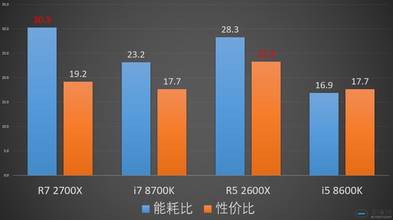 体验到此,新处理器的性能已经没有悬念,综合处理器的性能、功耗和价格因素,我帮大家做了一个直观的性价比、能耗比对比指数,以此方便的说明为什么文章一开始我要说只有8代酷睿的话,英特尔将难以阻挡第二代AMD锐龙处理器在高端DIY市场攻城略地的速度。因为这两个指数可以理解为产品力的直观表现,如果不大幅调整售价或者尽快推出新产品,现有酷睿产品的产品力显然难以和2代锐龙抗衡……