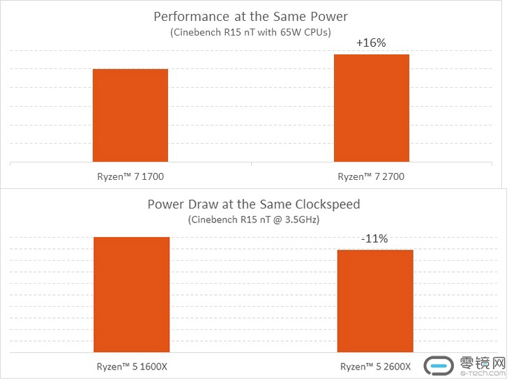 按照AMD官方的说法,在同频率对比中,2代的功耗比1代降低11%左右。或者在同TDP对比中,2代锐龙的性能要比1代 锐龙强16%左右。