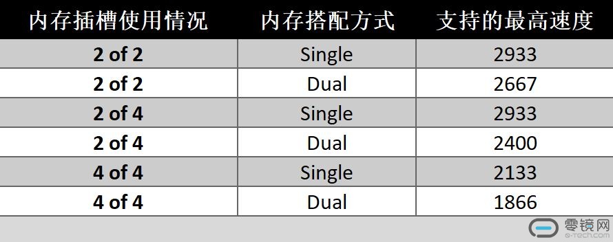 这里需要注意,并不是在任意搭配下都能支持到最高的DDR4 2933规格,具体配置相见下表,双通道下最高其实只到2667。