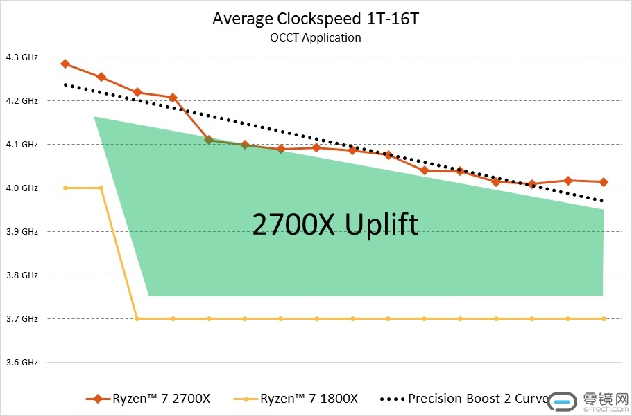 这块其实在我们评测锐龙R5 2400G的时候已经提到过,灵活的算法加上更精细的功耗管理机制,能够让2代锐龙工作在更高的加速频率上。比如用OCCT让CPPU满载时,1代的锐龙R7 1800X只能让最多2个线程工作在4GHz以上,其它不超过3.7GHz;对比起来2代锐龙R7 2700X则可以将所有线程工作在4GHz以上,最高的可以达到4.3GHz!高频率自然带来更好性能。