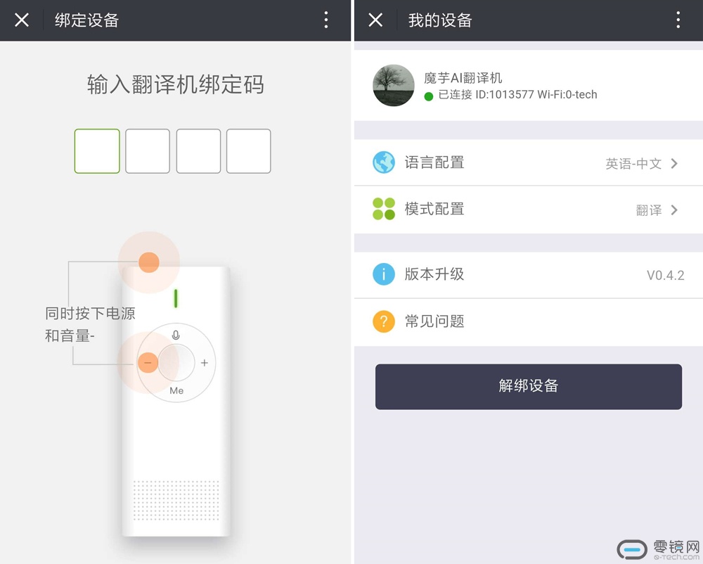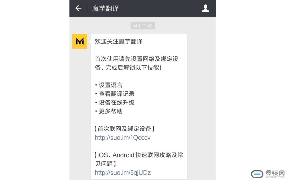 与通常大多数硬件设备需要新下载APP应用不同,魔芋AI翻译机在微信上便可进行设置。仅需关注魔芋官方公众号,按照提示步骤操作即可。