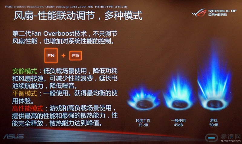 通过按FN + F5或通过游戏中心热键可访问Overboost应用程序,在其中可选择三种不同的风扇设置。 Fan Overboost提供最快的风扇速度,以保证激烈的游戏中能充分利用ROG 枪神 Ⅱ 和ROG 魔霸 Ⅱ的强大性能。静音模式可抑制风扇速度和功耗,适用于要求不高的任务。平衡模式可在中等噪音水平下提供稳定的性能。