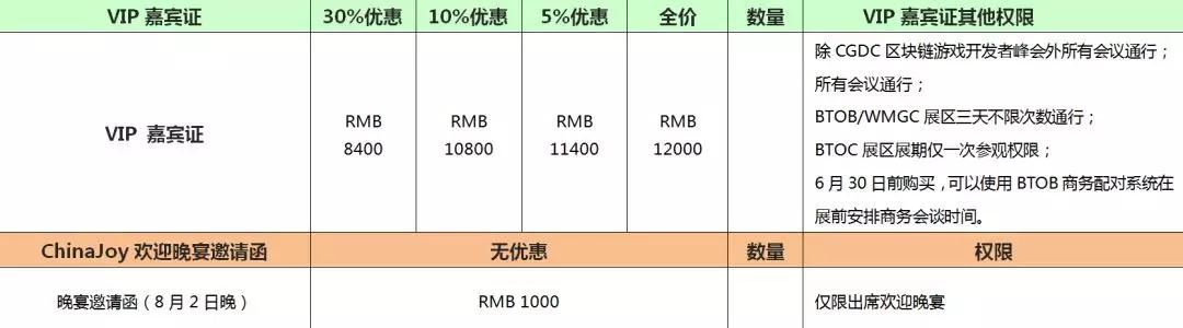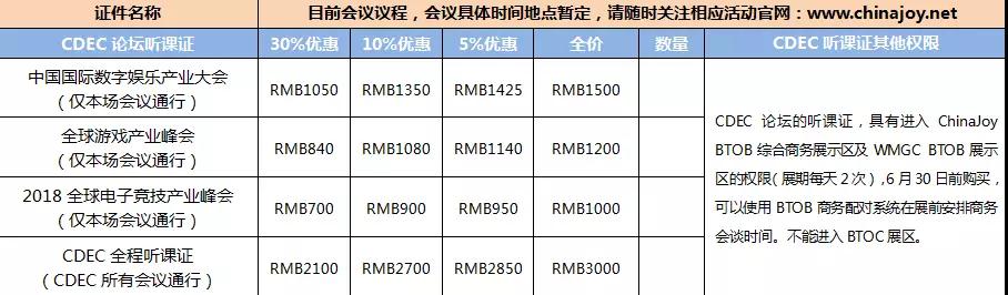 与BTOC展区不同,参加BTOB综合商务洽谈区或各种同期会议均需购买或申请相应的专业观众证和听课证。为了回馈早期购买证件的业内各界人士,ChinaJoy主办方汉威公司与往年一样,特别为相关证件的购买设置了不同时段的优惠期。