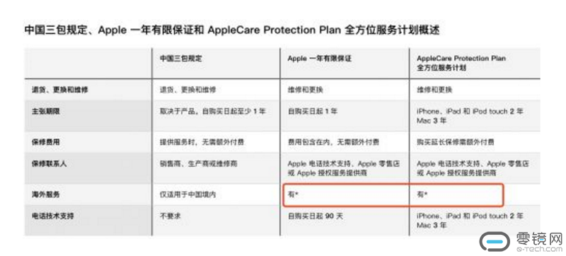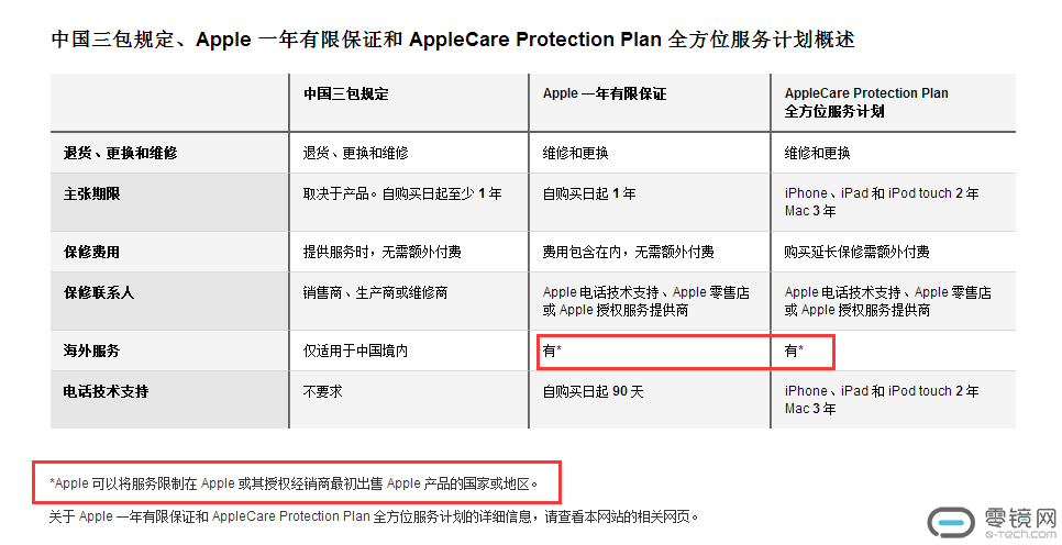 本着求真的精神,我们按照苹果官网-技术支持-免费提供的支持-什么是免费提供的支持?-此处找到了《Apple产品与中国消费者权益相关法律法规》一文,并找到了图示图片,清晰大图奉上。但是需要注意的一点是,在“有”字上标有星号,也就是说下面还有注释。注释中明确写道:Apple 可以将服务限制在 Apple 或其授权经销商最初出售 Apple 产品的国家或地区。