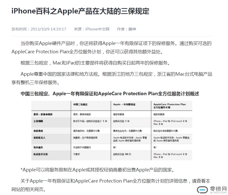 从昨天开始,陆续有媒体爆料,称“有网友发现,苹果悄悄修改了保修条款,最新的保修条款规定苹果正常一年售后服务以及Apple Care+全球通用。”并煞有介事的放出了一张标注有“中国三包规定、Apple一年有限保证和AppleCare Protection Plan 全方位服务计划概述”的图片。