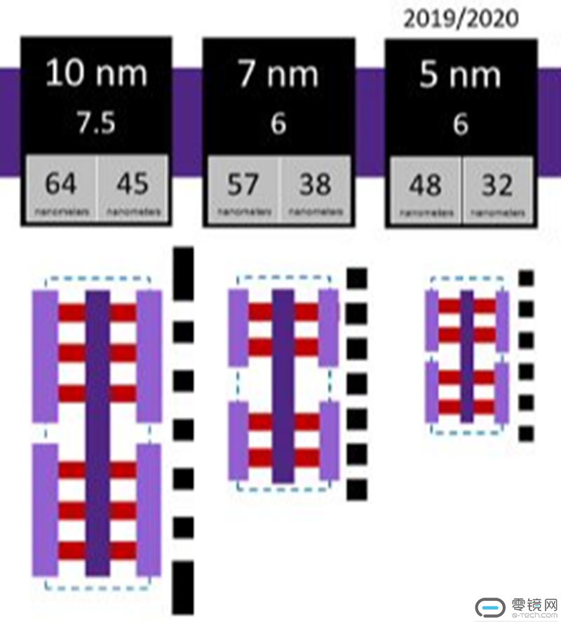 根据摩尔定律,每次节点的更替都是关键的晶体管规模尺寸缩小为原来的0.7倍或0.8倍,大约相当于晶体管密度翻倍。所以到了5nm时需要一个更有潜力的晶体管形式,芯片制造商们希望能够遵循由摩尔定律阐明的传统的晶体管缩放比例。在确定5nm节点规格上,使用的方法是参考英特尔14nm工艺规格并采取缩放0.7或0.8倍的方法。