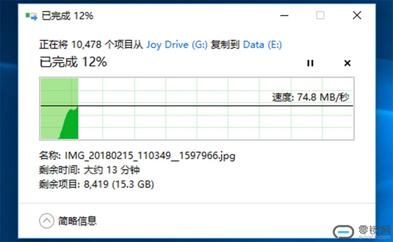 相对于从手机到Joy Drive乐备宝的备份速度,再将数据从Joy Drive乐备宝转移到电脑上就快多了,因为连接电脑是使用专门的USB 3.0线缆,在USB 3.0接口下,Joy Drive乐备宝的理论传输速度可以达到130MB/S。而我们之前花费半个小时备份的数据,传输到电脑大约花费了5分钟时间(实际速度有波动,电脑预测时间不准确)。