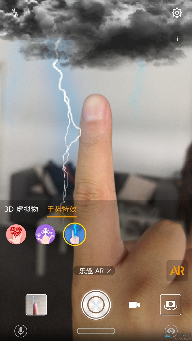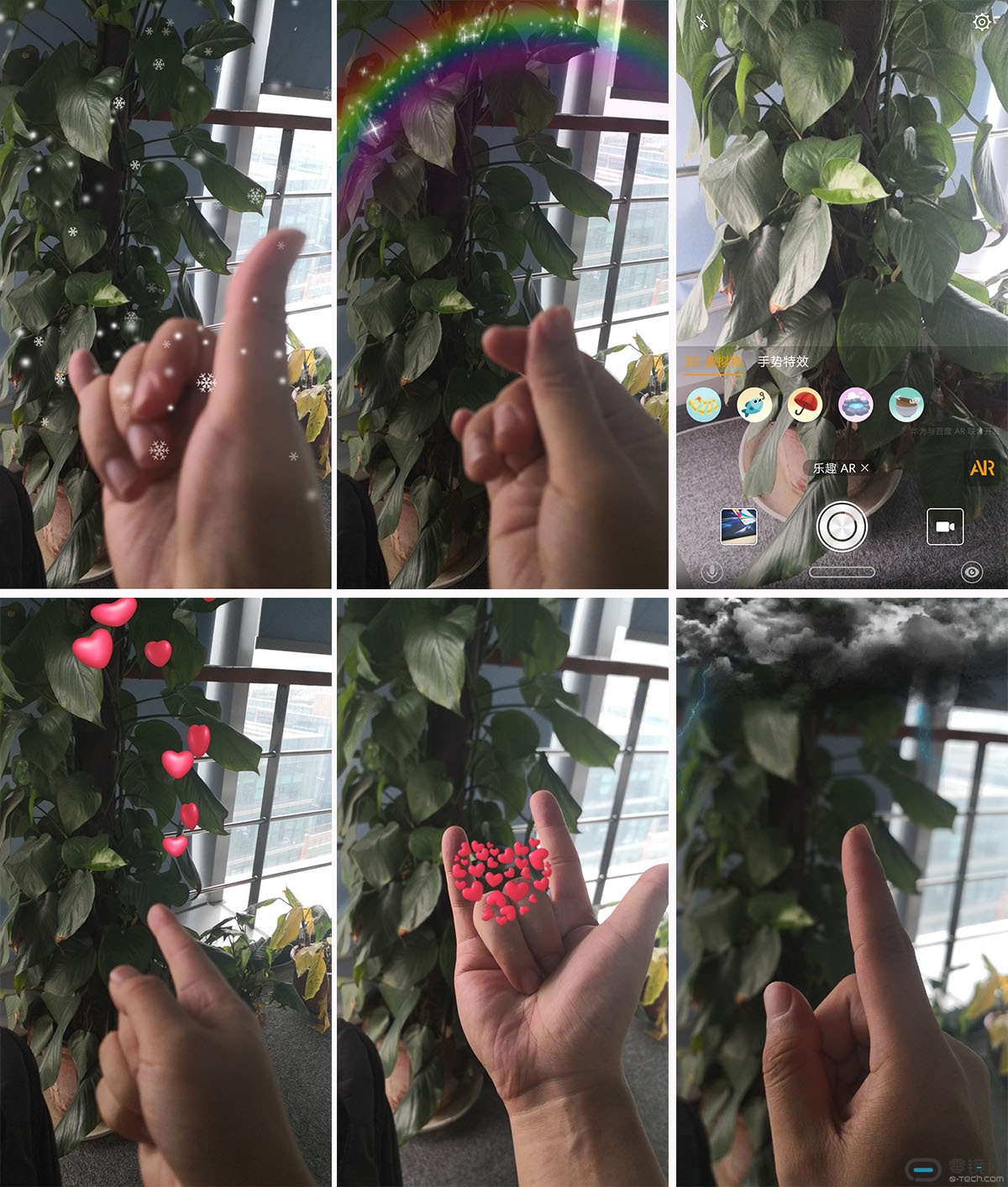 此次相机更新中最令编者欢喜的还属乐趣AR,支持丰富的手势特效和3D虚拟物特效,编者换手势之间,相应的AR场景也跟着出现变化,就编者体验来看,AR手势识别的成功率和反映灵敏度非常之高。而且相应的AR场景不仅有男生款,还有女生最爱的比心、彩虹款。
