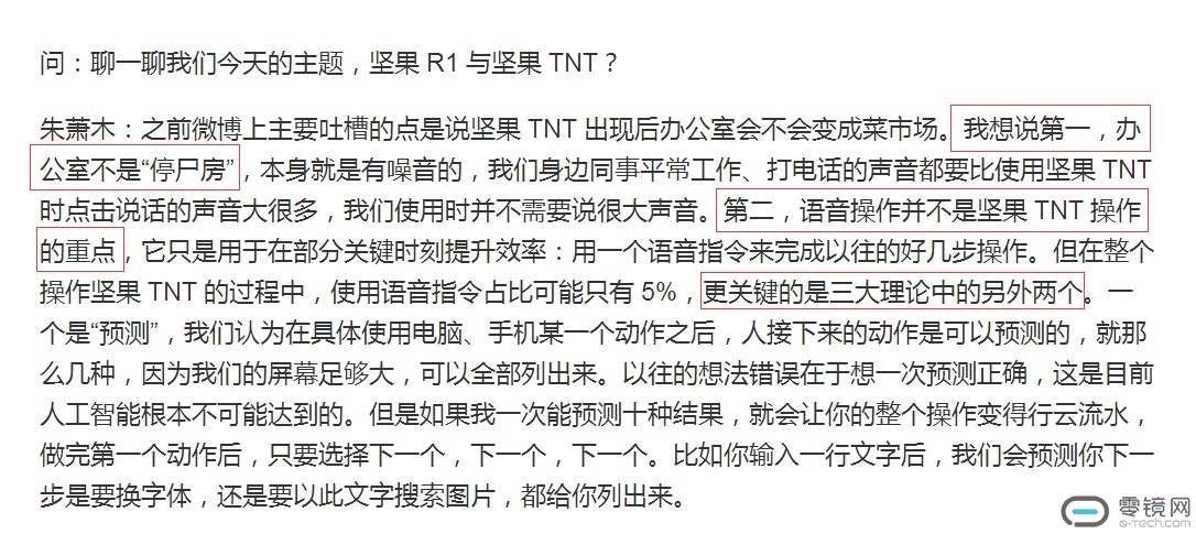 而针对于“办公室是否会变成吵闹的菜市场”这一问题,老罗在微博上曾进行过回应。甚至这个回应似乎还不够,锤子两位产品经理朱萧木、朱海舟在做客喜马拉雅时专门针对坚果R1与TNT工作站进行了回应。朱萧木表示,语音指令并非全部,更为关键的是“预测”以及“发牌手”。他甚至认为,所有的黑粉都没有“黑到位”。