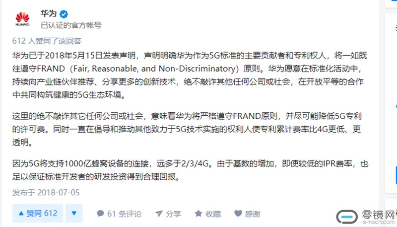 华为轮值董事长徐直军在2018 MWC上海演讲时表示:华为愿意在标准化活动中,持续向产业链伙伴推荐、分享更多的创新技术,绝不敲诈其他任何公司或社会,在开放平等的合作中共同构筑健康的5G生态环境。这里的绝不敲诈其它任何公司或社会,意味着华为将严格遵守FRAND原则,并尽可能降低5G专利的许可费。同时一直在倡导和推动其他致力于5G技术实施的权利人使专利累计费率比4G更低、更透明。现在看来确实比4G更低,高通5G专利收费标准是3、4G的6.5折,华为也是这个折后价。