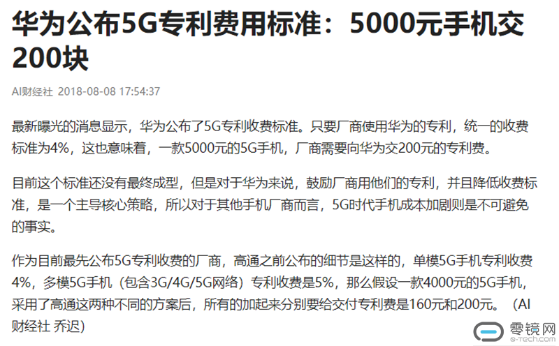 华为公布的5G专利收费标准为:只要厂商使用华为的专利,统一的收费标准为4%,这也意味着,一款4000元的5G手机,厂商需要向华为交160元的专利费。