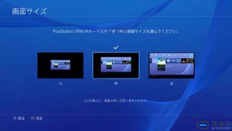 影院模式中有用来浏览PS4系统UI以及所有非VR游戏和应用的虚拟屏幕。这个屏幕拥有多种尺寸,小(相当于117寸、视野角度54度)、中(163寸、视野角度71.5度)、大(226寸、视野角度90度),虚拟屏幕放置在你6英尺-10英尺(1.8米-3米)的距离(不同的人感受到的屏幕尺寸也可能不同)。
