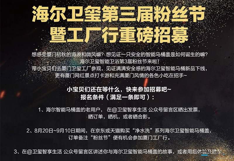 目前,海尔卫玺粉丝招募已面向全网开启,大家可通过海尔卫玺官方微博、微信,京东海尔卫玺官方旗舰店、天猫海尔卫浴旗舰店等渠道参与报名。还在犹豫什么?厦门的蓝天白云、鼓浪屿的海浪沙滩、曾厝垵的皎洁月光都准备好了,就等你了!