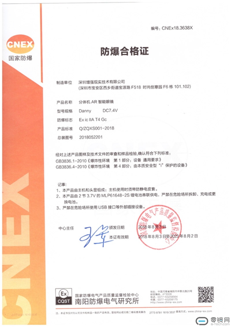 8月3日,国家防爆电气产品质量监督检验中心南阳防爆电气研究所向0glass AR 智能眼镜Danny颁发防爆合格证,这是全国首款取得防爆认证的AR智能眼镜!0glass无疑是AR智能眼镜工业应用的领航者。0glass本次取得认证的danny AR智能眼镜专门针对易燃易爆危险工业环境设计,可以在石油、化工、冶金、煤炭、食品加工、半导体制造以及其他化工制造行业等危险区域广泛使用。